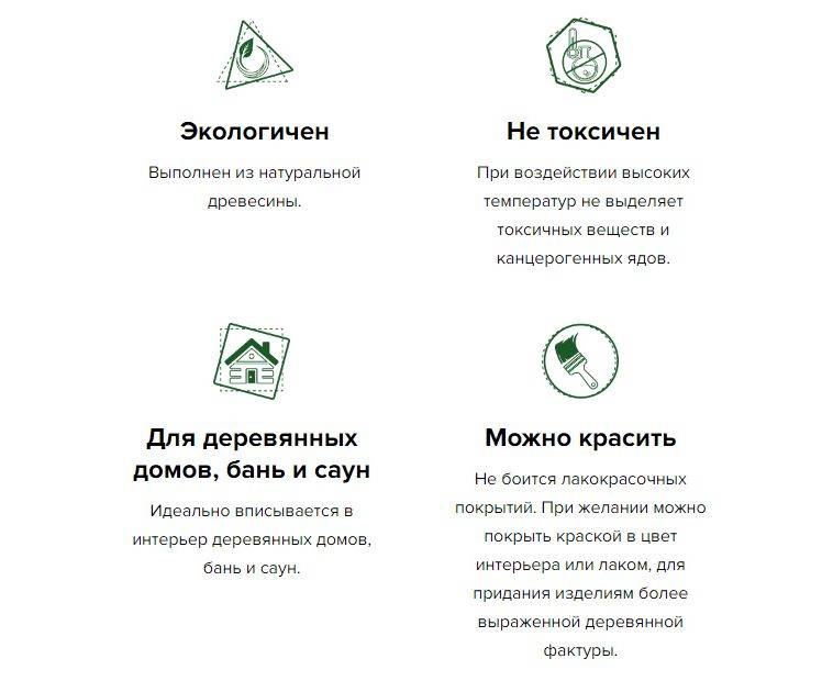 | Выполнен из натуральной древесины. | При воздействии высоких температур не выделяет токсичных веществ и канцерогенных ядов. | Идеально вписывается в интерьер деревянных домов, бань и саун. | Не боится лакокрасочных покрытий. При желании можно покрыть краской в цвет интерьера или лаком, для придания изделиям более выраженной деревянной фактуры. |