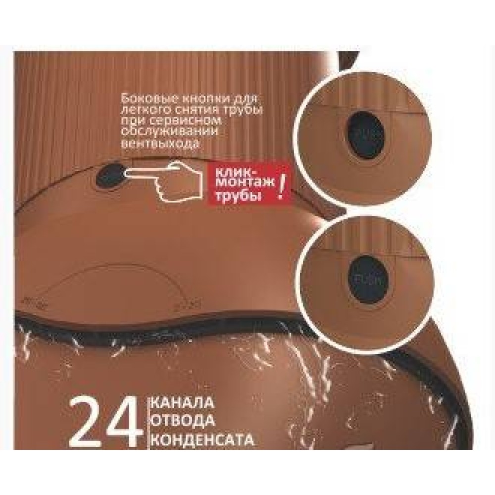 Вентиляционные выходы обеспечивают воздухообмен в помещениях, оберегают здание от образования грибков и уменьшают влажность, продлевают срок службы конструкции. Преимущества Wirovent EVO: Правильный поток воздуха без сужения вентиляционного канала. Продленный отвод конденсата с 24 каналами. Встроенный спиртовой уровень для точного и легкого позиционирования. Увеличенный воздухозабор благодаря горизонтальным отверстиям. Клик-монтаж трубы. Боковые кнопки для легкого снятия трубы при сервисном обслуживании. Скрытые крепежные винты..