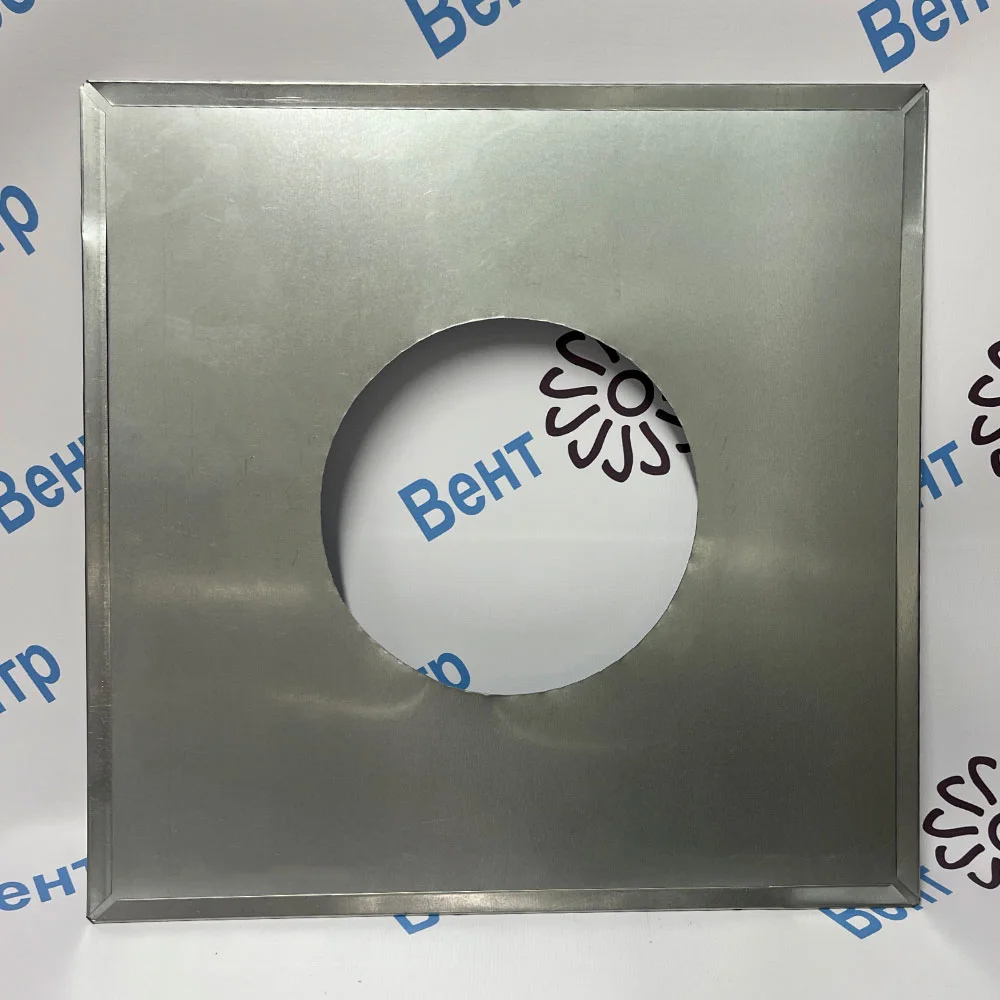 Пластина к ППУ представляет собой квадратный лист с отверстием под диаметр трубы, который предназначен для устройства прохода через внутреннюю часть крыши с целью дополнительной фиксации оси дымохода при прохождении крыши и придания эстетического вида месту прохода дымохода через крышу с внутренней стороны (потолка чердачного или иного помещения).