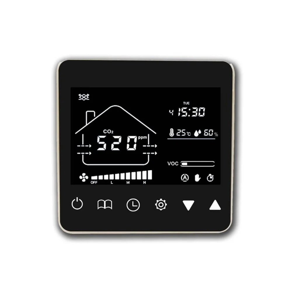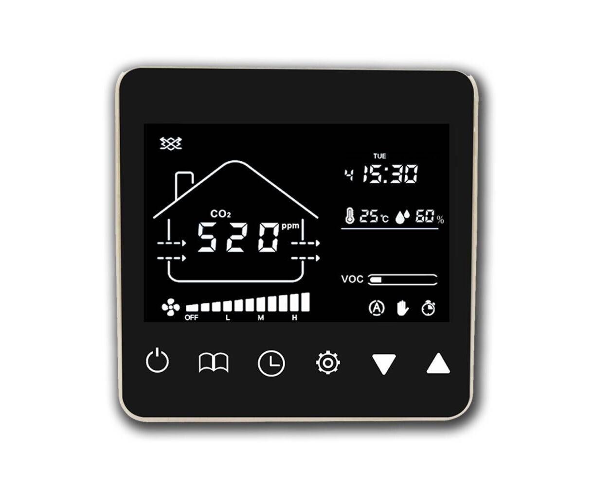 Салюс TkV-03 CO2 Децентрализованная вентиляционная приточная установка с электрическим подогревом воздуха и настенным механическим блоком управления.