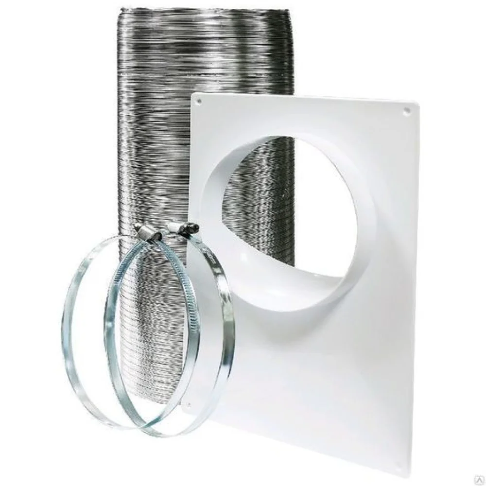 - В комплект поставки входит: 2 хомута, пластиковая торцевая площадка ПТП и металлический гибкий воздуховод ВА.